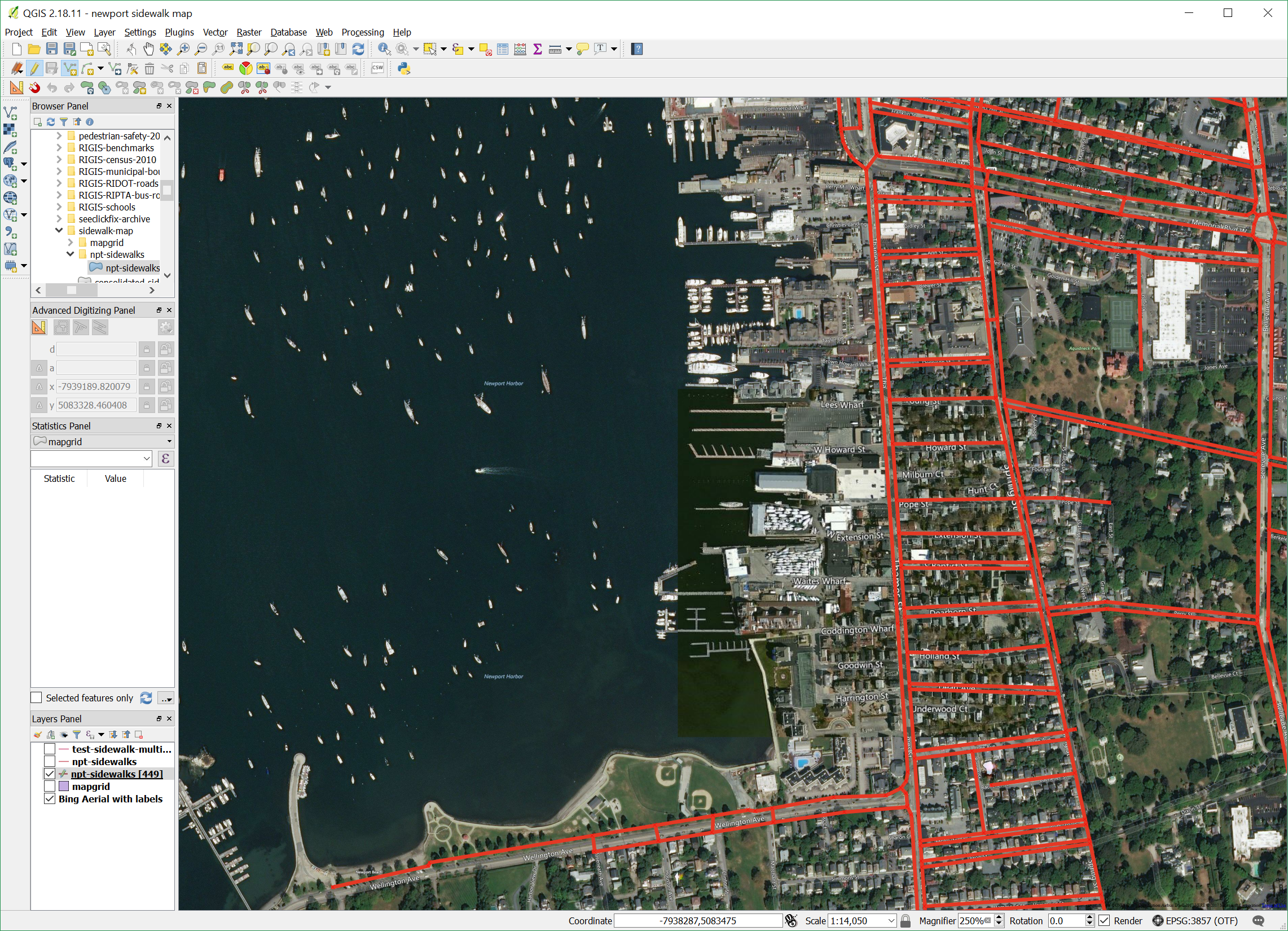 If you've walked around Newport, you may have noticed the, um, quirky qualities of our sidewalks. You probably know that they are only on one side of some streets, end halfway down a block on others, and just don't go places one might expect. But probably no one can draw a detailed accurate picture, or quantify how many streets don't have sidewalks. To begin to answer this question completely, we need to document the sidewalks and organize the information into one place. That is, we need to build a dataset.